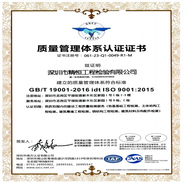 质量管理体系认证证书